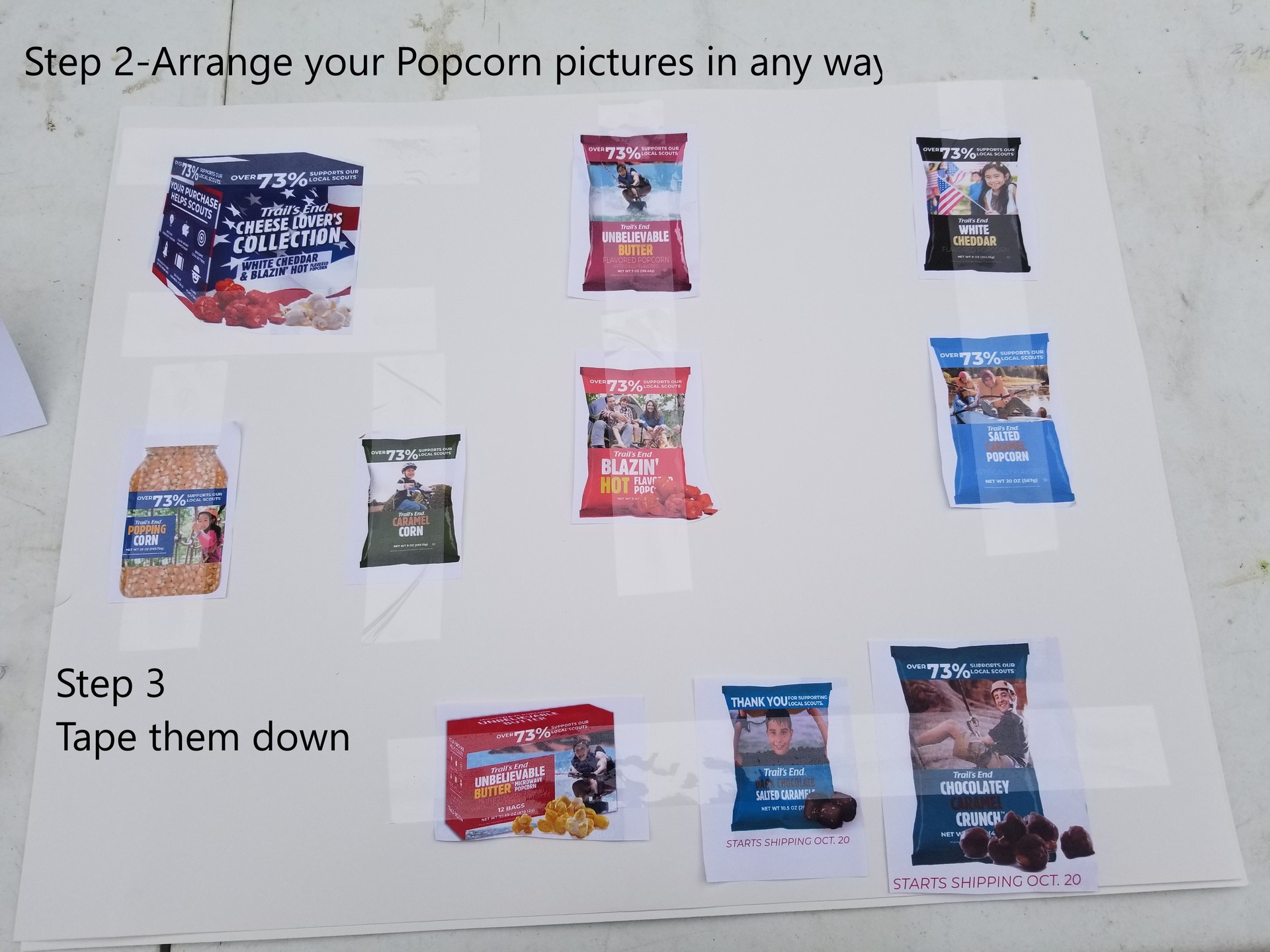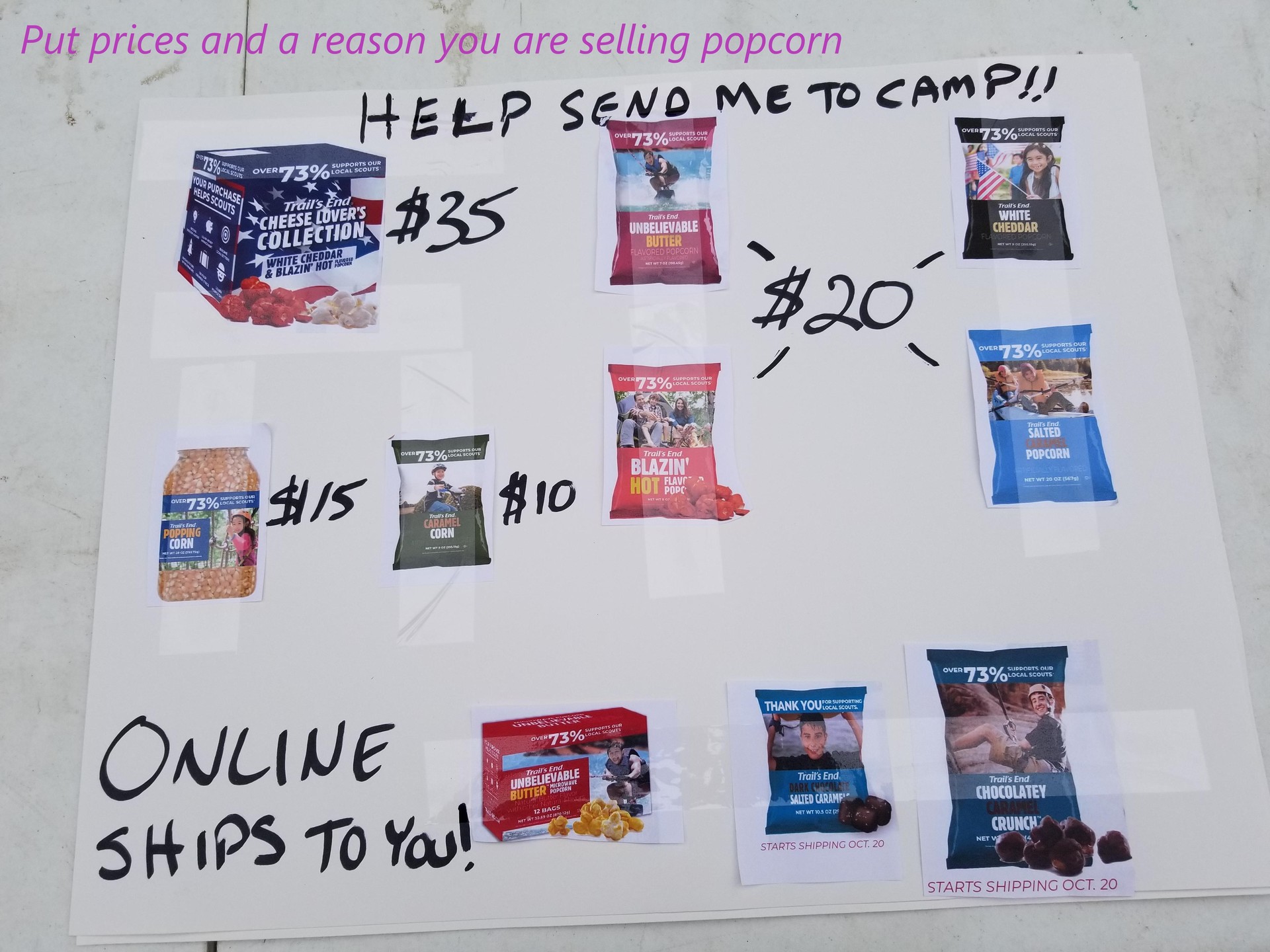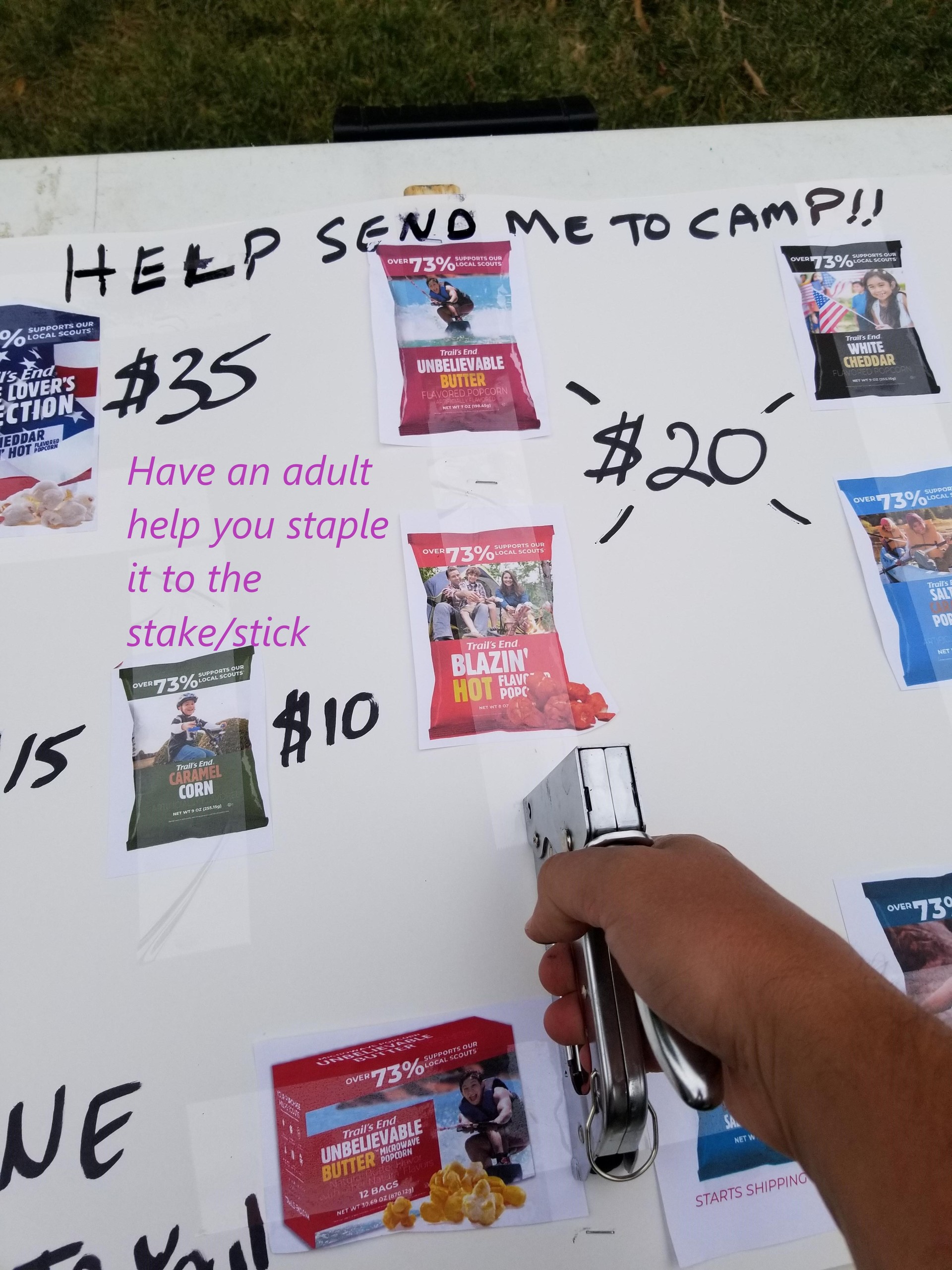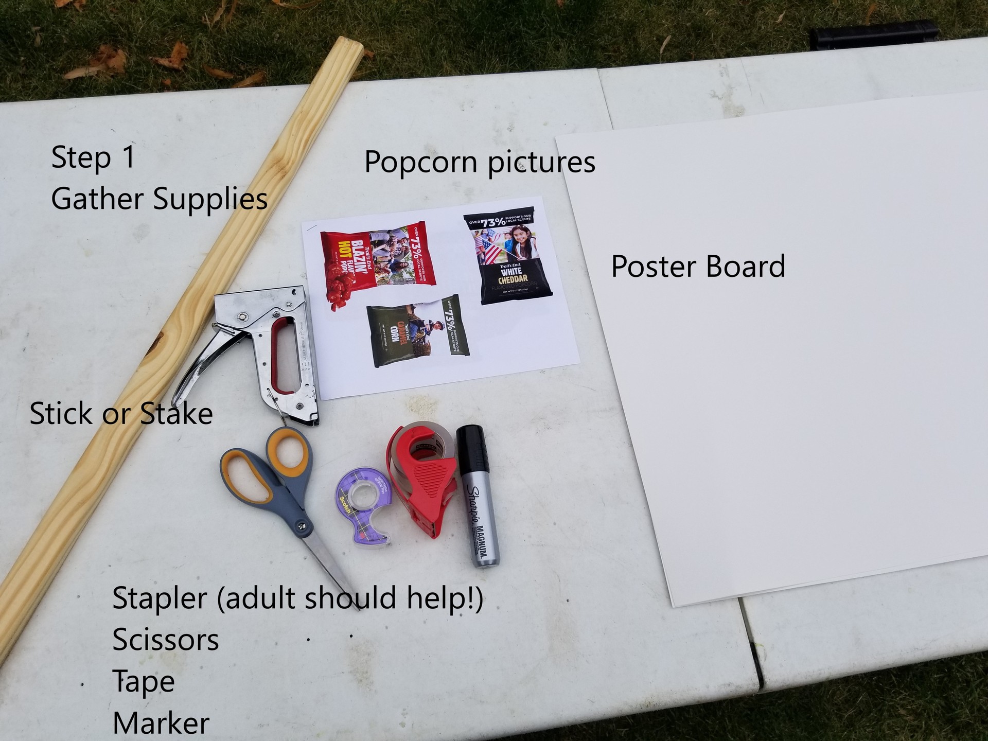 With a few items and some help from an adult, you can make an eye catching sign to help you sell popcorn and social distance!